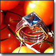 Für diesen quadratischen, und somit streng geometrischen Stein mit dem modernen Contex-Cut Schliff wählten wir ein ebenso modernes und geometrisches Ringdesign. Drei breitere, sechseckige Ringe wurden jeweils mit etwas Zwischenraum zu einem einzigen Ring zusammengefügt. Die Verstrebungen stehen ganz leicht über, damit optisch ein fast technischer Eindruck entsteht. Mit der Fassung und dem quadratischen Stein fügt sich alles zu einem wunderschönen, modernen Ring zusammen.